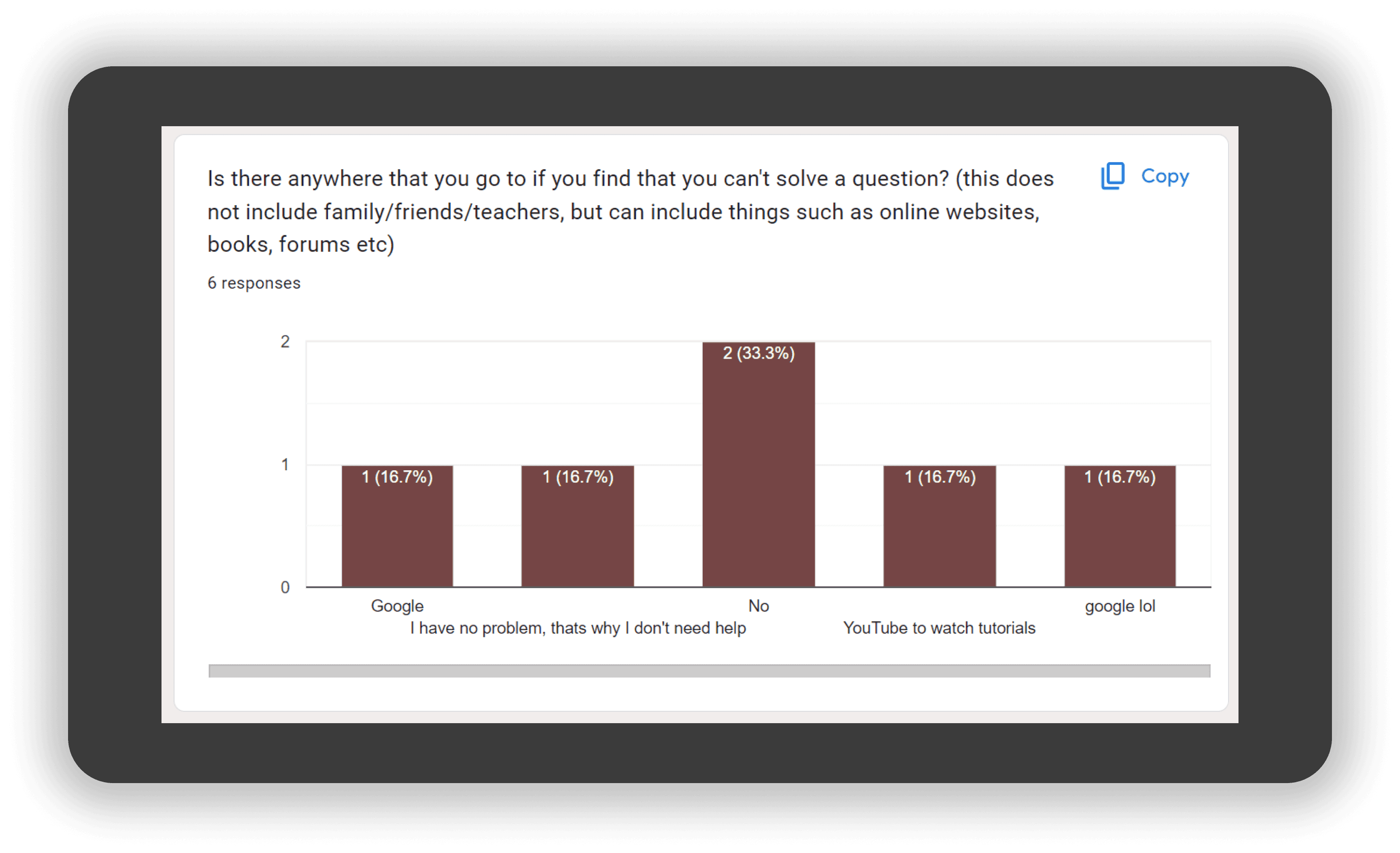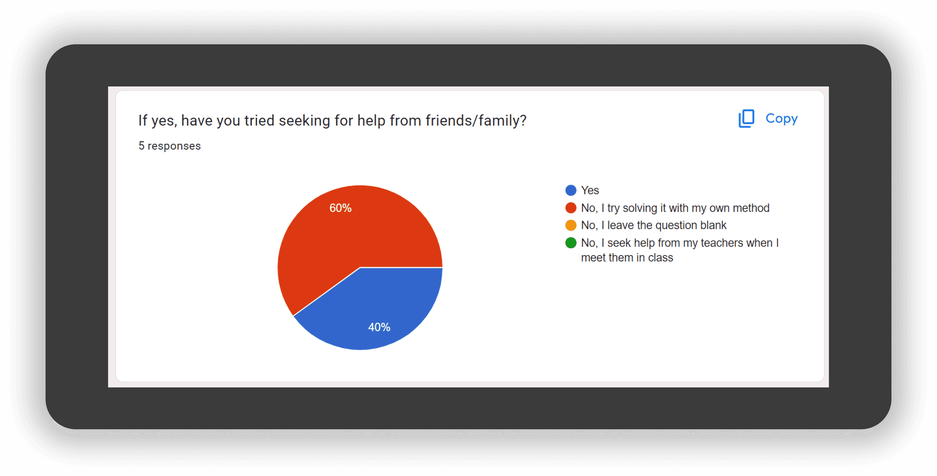 The questions were designed to identify whether students typically seek help from teachers or tutors, rely on online resources, or turn to social and digital platforms for support. This also allowed me to understand which platforms students commonly use when searching for academic assistance.