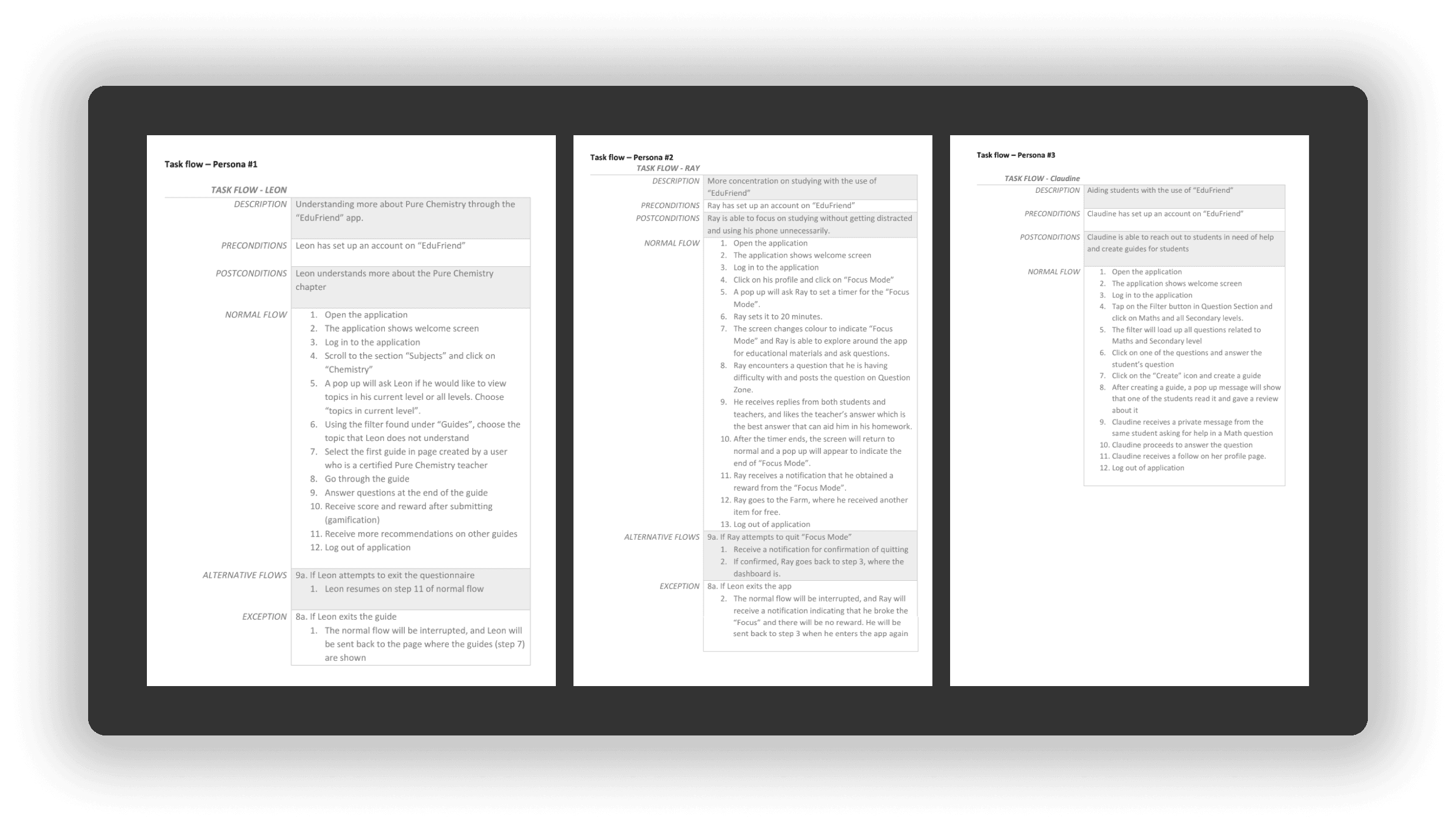 I began by developing three user personas representing the key user groups: primary school student, secondary school student, and secondary school teacher. Each persona was created with distinct goals and objectives to reflect their differing needs and roles within the learning ecosystem.